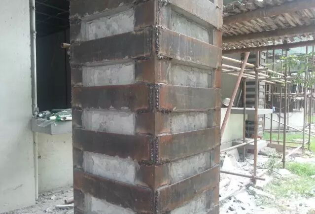 該法是在構(gòu)件外圍包以型鋼的加固方法, 具體可分為濕式外包鋼加固法和干式外包鋼加固法。一般用于混凝土柱、梁、屋架,特別是大型結(jié)構(gòu)和大跨度結(jié)構(gòu)的加固。其中濕法是指型鋼與構(gòu)件通過乳膠水泥、環(huán)氧樹脂等粘結(jié)劑與原構(gòu)件粘結(jié), 新加型鋼與原構(gòu)件形成整體共同工作; 干法指新加型鋼與原構(gòu)件之間不采用粘結(jié)劑粘結(jié), 不能保證結(jié)合面剪力的有效傳遞。在抗震加固中一般采用濕式外包鋼加固法。適用于加固鋼筋混凝土梁、柱及磚柱、磚煙囪等,但對于圓形和曲面構(gòu)件加固工藝則相對復(fù)雜。它具有施工方便,現(xiàn)場工作量少,能有效提高構(gòu)件抗震性能的優(yōu)點, 其優(yōu)點是施工方便,現(xiàn)場工作量少,受力可靠。缺點是用鋼量較大,加固維修費用較高。當采用化學(xué)灌漿外包鋼加固時,型鋼表面溫度不應(yīng)超過六十度;當環(huán)境具有腐蝕性介質(zhì)時,應(yīng)有可靠的防護措施。